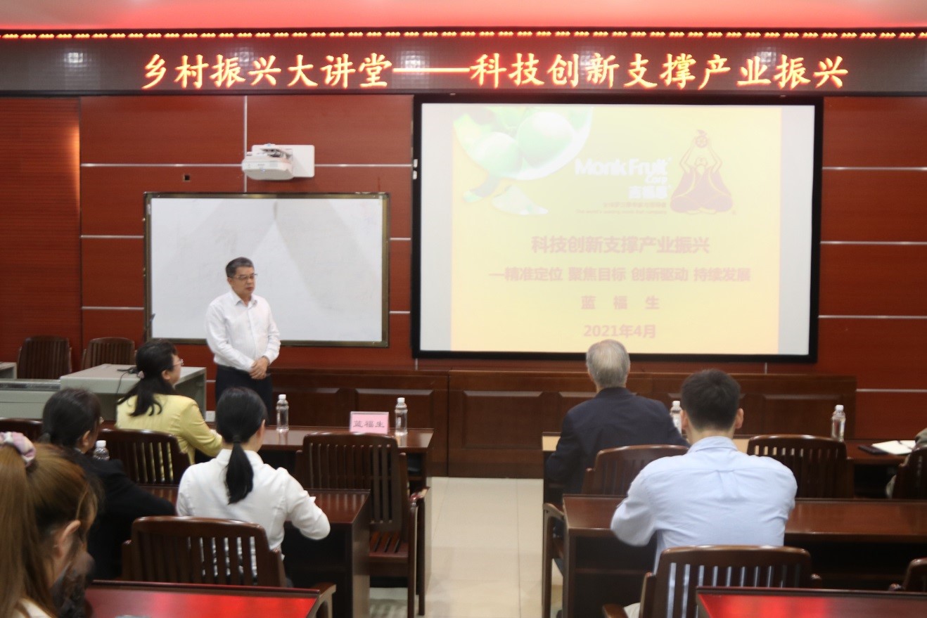 4月27日,农业技术推广研究员、桂林吉福思罗汉果有限公司董事、总裁蓝福生做客suncitygroup太阳新城乡村振兴大讲堂,为师生作了主题为“科技创新支撑产业振兴”的报告。