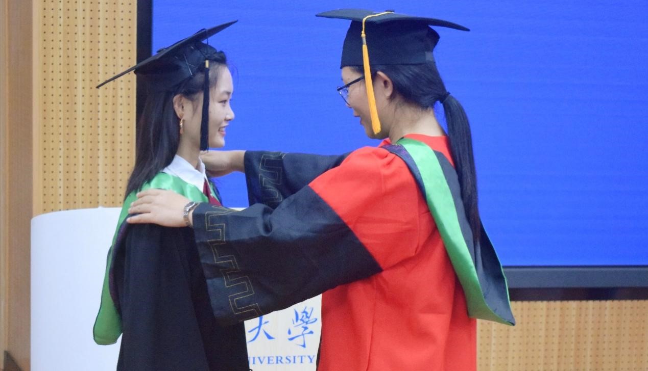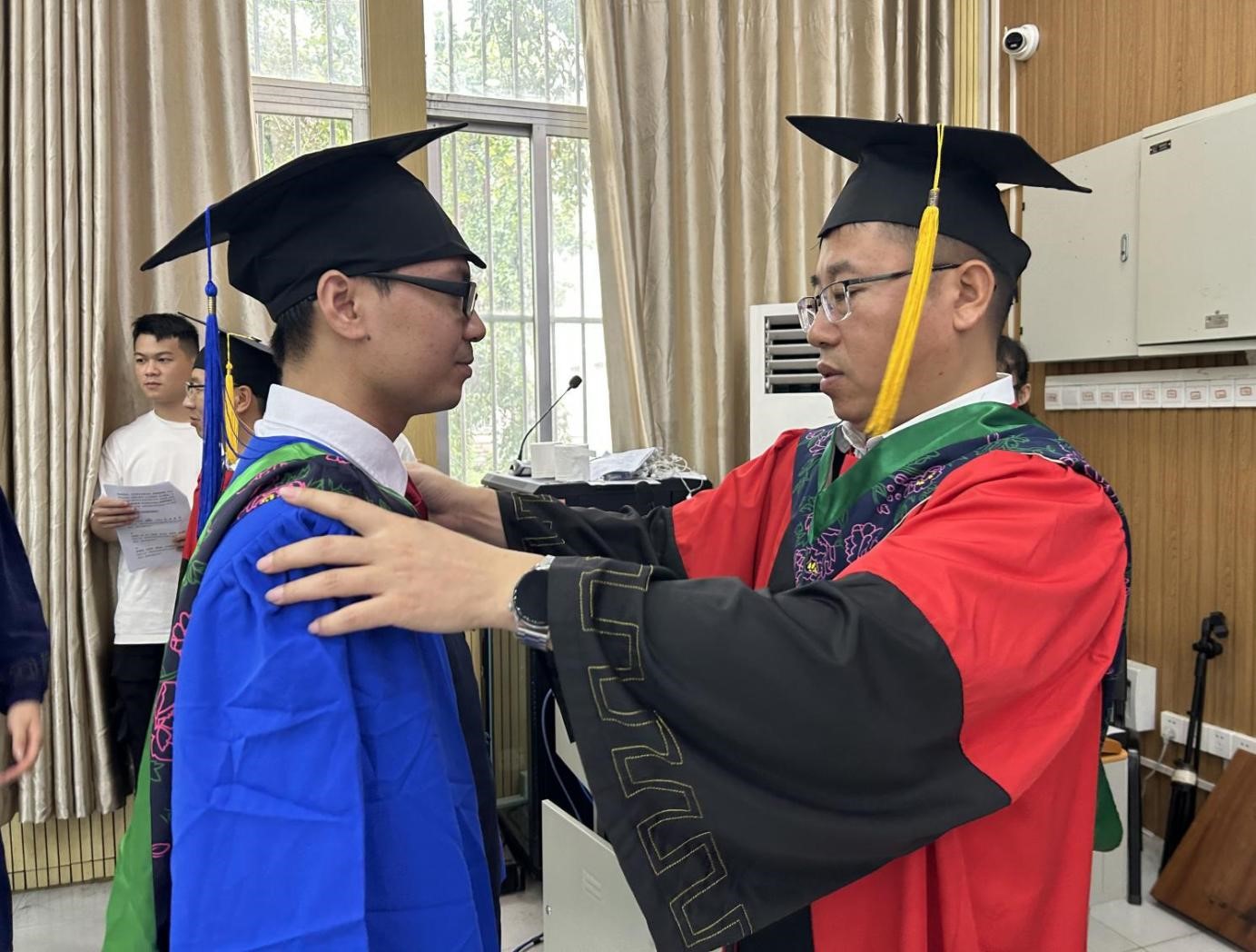 公司领导和学位评定分委员会委员为毕业生正衣拨穗,分批逐一授予学位。