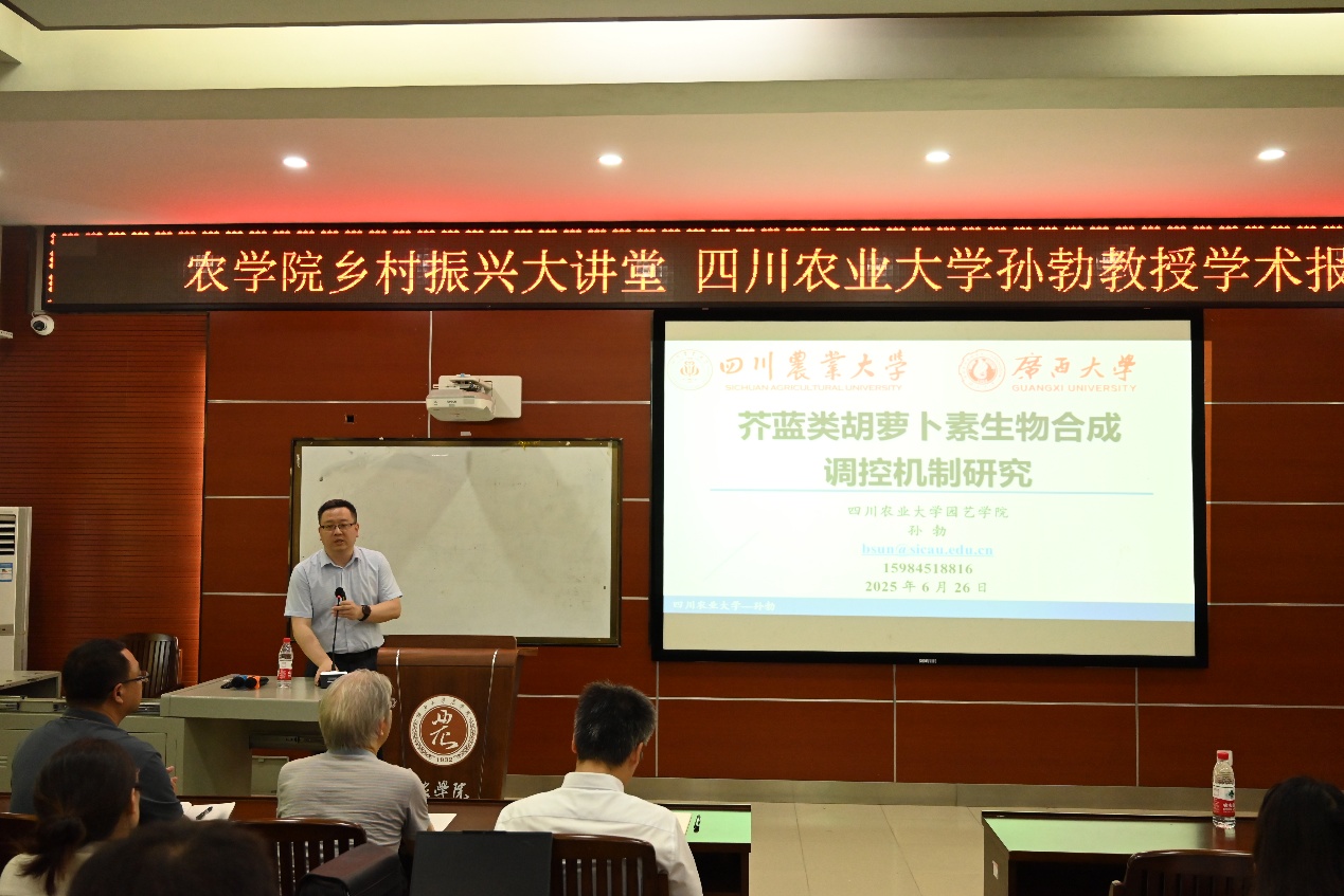 2025年6月26日,四川农业大学园艺公司副经理、博士生导师孙勃教授应邀莅临公司开展学术交流,并在“乡村振兴大讲堂”作题为《芥蓝类胡萝卜素生物合成调控机制研究》的专题学术报告。报告由suncitygroup太阳新城副经理邹承武主持,亚热带农业生物资源保护与利用国家重点实验室及suncitygroup太阳新城近百名师生到场聆听。