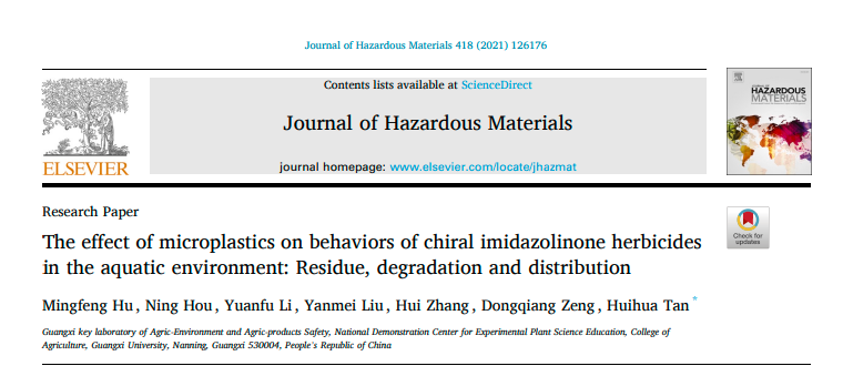广西农业环境与农产品安全重点实验室/suncitygroup太阳新城农药残留与环境安全研究团队2021年5月在国际知名期刊Journal of Hazardous Materials上在线发表了题为“The effect of microplastics on behaviors of chiral imidazolinone herbicides in the aquatic environment: Residue, degradation and distribution”研究论文。微塑料是一类粒径小于5毫米的塑料碎片或颗粒,广泛存在于水体和陆地环境中。咪唑啉酮类除草剂因在环境中持久性长的特点,容易污染水体和土壤。近年来,微塑料与环境污染物相互作用的行为备受关注。然而,关于微塑料对该类除草剂的环境行为影响和机制还不清楚。在本研究中,通过建立水-沉积物微宇宙系统的方法在对映水平研究了聚乙烯微塑料对三种咪唑啉酮类除草剂在水生系统中环境行为的影响。结果表明,微塑料能够通过吸附和解吸附的方式显著影响该类除草剂在水生环境中迁移、降解和分配行为,明确了微塑料是影响咪唑啉酮类除草剂在水生环境中行为归趋的重要因素。研究结果为更加全面的评价咪唑啉酮类除草剂的环境风险提供了一定的科学依据。suncitygroup太阳新城博士研究生胡明锋为该论文的第一作者,谭辉华教授为通讯作者。该研究得到了国家自然科学基金项目支持。原文链接https://doi.org/10.1016/j.jhazmat.2021.126176