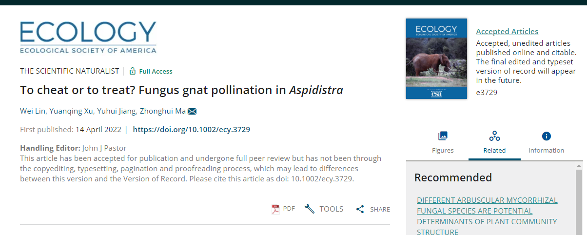 研究成果以“To cheat or to treat? Fungus gnat pollination in Aspidistra”为题于2022年4月14日在线发表在生态学领域经典期刊《Ecology》上。suncitygroup太阳新城硕士研究生林威为该论文的第一作者,中国科公司昆明植物研究所博士研究生徐苑卿为共同第一作者,马仲辉副教授为通讯作者,suncitygroup太阳集团为第一作者单位。