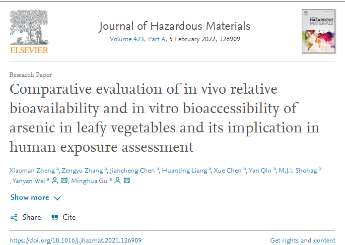 广西农业环境与农产品安全重点实验室/suncitygroup太阳新城耕地质量与安全利用研究团队近期在国际知名期刊Journal of Hazardous Materials上发表题为“Comparative evaluation of in vivo relative bioavailability and in vitro bioaccessibility of arsenic in leafy vegetables and its implication in human exposure assessment”研究论文。叶菜类蔬菜中的砷已经成为人体摄入砷的主要来源之一,因此科学准确地评估蔬菜中砷经口暴露对人体的健康风险尤为重要。砷生物有效性是人体健康风险评估的重要因子。但可获得生物有效性的动物模型试验花费高、耗时,不能满足大批量样品的测试需求。因此,建立科学可靠的预测模型,以快速准确地预测我国叶菜类蔬菜中砷的生物有效性,对准确评价叶菜类蔬菜中砷暴露引起的人体健康风险具有重要的理论和实践指导意义。本研究采用大鼠动物模型准确地测定所选蔬菜的砷相对生物有效性,通过建立体内体外相关性模型,明确了PBET (Physiologically Based Extraction Test)体外方法对叶菜类蔬菜砷人体生物有效性的预测能力最佳。并应用此模型预测不同种类蔬菜中砷的生物有效性及其健康风险。研究结果为更加全面的评价蔬菜中砷的人体健康风险评价提供了一定的参考。