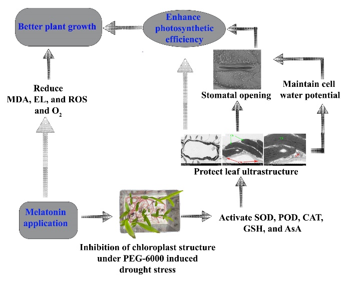 本研究分析了干旱胁迫下褪黑素对玉米幼苗酶促和非酶促抗氧化防御机制,以及与叶片超微结构和气孔性状的关系。结果表明,干旱胁迫产生过多的活性氧(ROS)抑制玉米种子萌发、幼苗生长及叶片叶绿素含量。褪黑素通过调控细胞中ROS的释放,增强抗氧化防御能力、改善玉米幼苗叶片超微结构、减少叶绿素损失和氧化损伤的功能。