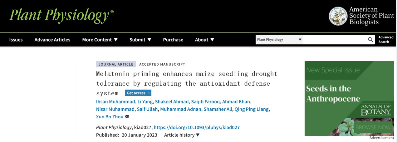 近日,suncitygroup太阳新城周勋波教授团队在国际知名期刊Plant Physiology在线发表了题为“Melatonin priming enhances maize seedling drought tolerance by regulating the antioxidant defense system”的研究论文,报道了有关褪黑素调控玉米幼苗期抗旱胁迫方面作用机制的最新研究成果。《Plant Physiology》创刊于1926年,是中科院生物学1区Top期刊,在植物科学领域有重要影响力。