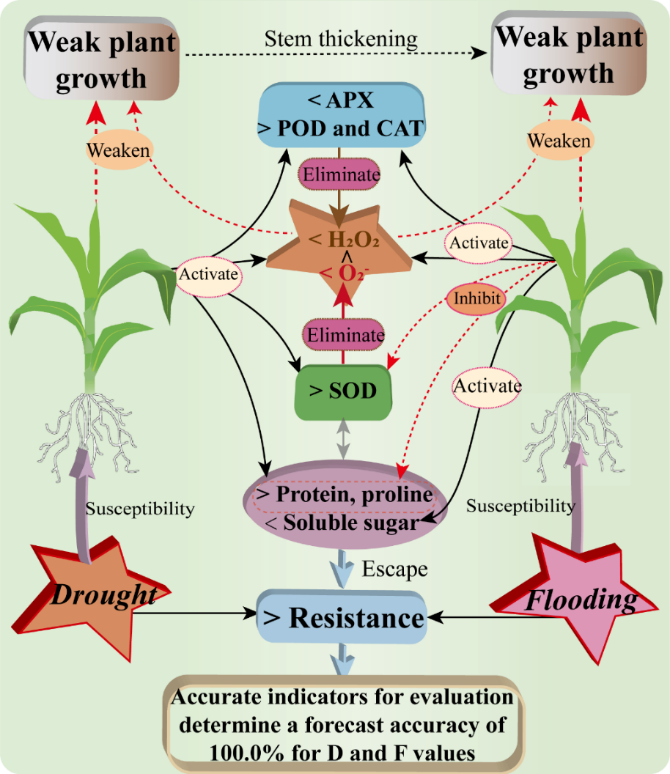 活性氧自由基(ROS)在旱涝胁迫下大量积累,与干旱相比,涝害下积累更多的ROS尤其是O2-。干旱胁迫下,抗氧化酶活性升高和渗透调节物质的大量积累促进了过量ROS的清除,以保护植物免受氧化损伤。然而,玉米种质在涝害胁迫下呈现与干旱不同的响应机制。涝害胁迫下,SOD活性、可溶性蛋白和脯氨酸含量下降,而APX、POD和CAT活性升高,促进了H2O2向O2-的转化和H2O2分解,从而导致O2-在涝害下大量积累。同时,与干旱相比,涝害胁迫下可溶性糖含量和APX活性显著升高,其他抗氧化酶活性和渗透调节物质含量显著降低,从而使玉米在涝害下积累更高的ROS,遭受更重的氧化损伤,玉米株高和叶面积显著下降。