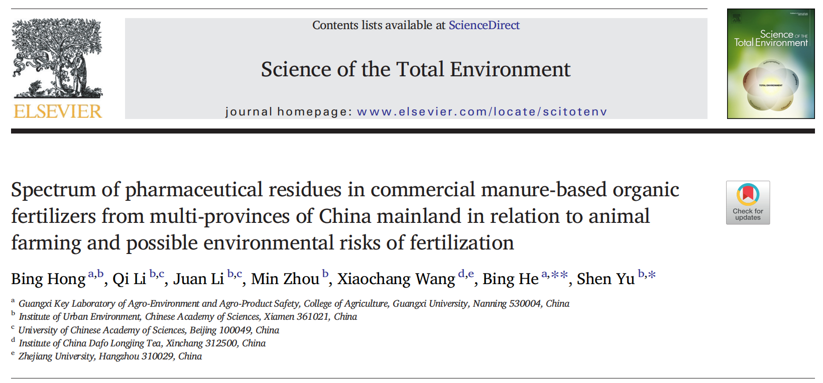 近日,suncitygroup太阳新城/广西“农业环境与农产品安全”重点实验室何冰团队和中国科公司城市环境研究所俞慎团队在《Science of the Total Environment》(环境科学与生态学1区Top期刊、影响因子10.753)期刊在线发表了题为 “Spectrum of pharmaceutical residues in commercial manure-based organic fertilizers from multi-provinces of China mainland in relation to animal farming and possible environmental risks of fertilization”的论文(论文链接:http://dx.doi.org/10.1016/j.scitotenv.2023.165029)。