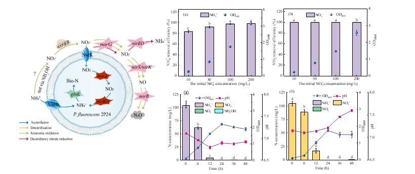 黄雪娇团队研究了生防菌Pseudomonas fluorescens 2P24的脱氮特性,发现P. fluorescens 2P24可在好氧条件下高效去除NH4+和NO3-,脱氮过程中未检测到有毒中间产物NO2-。利用基因组测序技术进一步探讨其氮代谢途径,发现P. fluorescens 2P24主要通过同化作用去除NH4+和NO3-,可有效防止氮素损失。研究结果揭示了生防菌的脱氮机制,为利用生防菌处理含氮废水提供理论依据。相关结果于2023年5月在线发表于生物工程与应用微生物类期刊《Bioresource Technology》。suncitygroup太阳新城、广西农业环境与农产品安全重点实验室为第一署名单位。