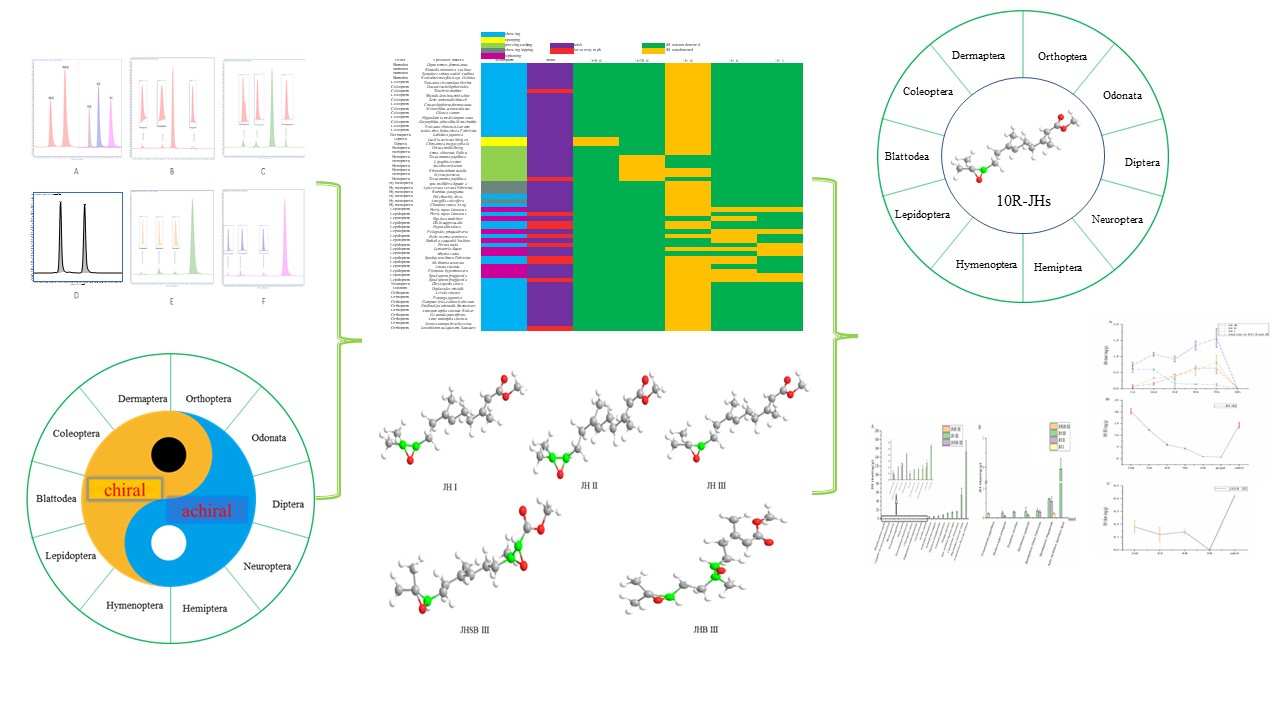 保幼激素(Juvenile Hormone,JH)作为昆虫最重要的内分泌激素之一,在调控昆虫体型外观、蜕皮、滞育、抗逆性、卵黄形成、生殖与交配行为,以及对社会性昆虫的分工、级型分化、胰岛素代谢通路、迁徙的形成等生理过程起着至关重要的作用。目前已明确昆虫体内共存在8种不同结构的JH,但不同JH在昆虫体内如何分布、滴度水平、立体构型差异等缺乏系统研究。团队首先建立了一种可检测昆虫整虫,而非血淋巴的UPLC-MS/MS的高灵敏度检测方法,采用方法对58种昆虫体内5种主要的保幼激素(JH I、JH Ⅱ、JH Ⅲ、JHB3和JHSB3:共18种手性异构体)进行分析。结果表明JHSB3、JHB3分别在半翅目、双翅目昆虫体内特异合成,JH Ⅰ、JH Ⅱ在鳞翅目中特异合成,JH Ⅲ在大多数昆虫中都存在,社会性昆虫JH Ⅲ滴度普遍较高。昆虫体内JH Ⅲ绝对构型均为10R,JH Ⅱ均为(10R,11S),JH Ⅰ均为(10R,11S),JHSB3均为(2R,3S,10R),JHB3为(6S,7S,10R),JHs立体构型具有高度保守性。有趣的是,我们的结果发现,单环氧化结构的JH Ⅲ在绝大多数昆虫体内合成,且社会性行为昆虫体内滴度普遍较高。双环氧化结构的JHSB3和JHB3均只在具有刺吸式口器的昆虫中发现,可能与其取食方式的进化存在某种关联。鳞翅目昆虫体内3种JH(JH Ⅰ、JH Ⅱ、JH Ⅲ)在幼虫期、成虫期呈现出各异的变化趋势,似乎表明3种JH具有明确的功能分工。