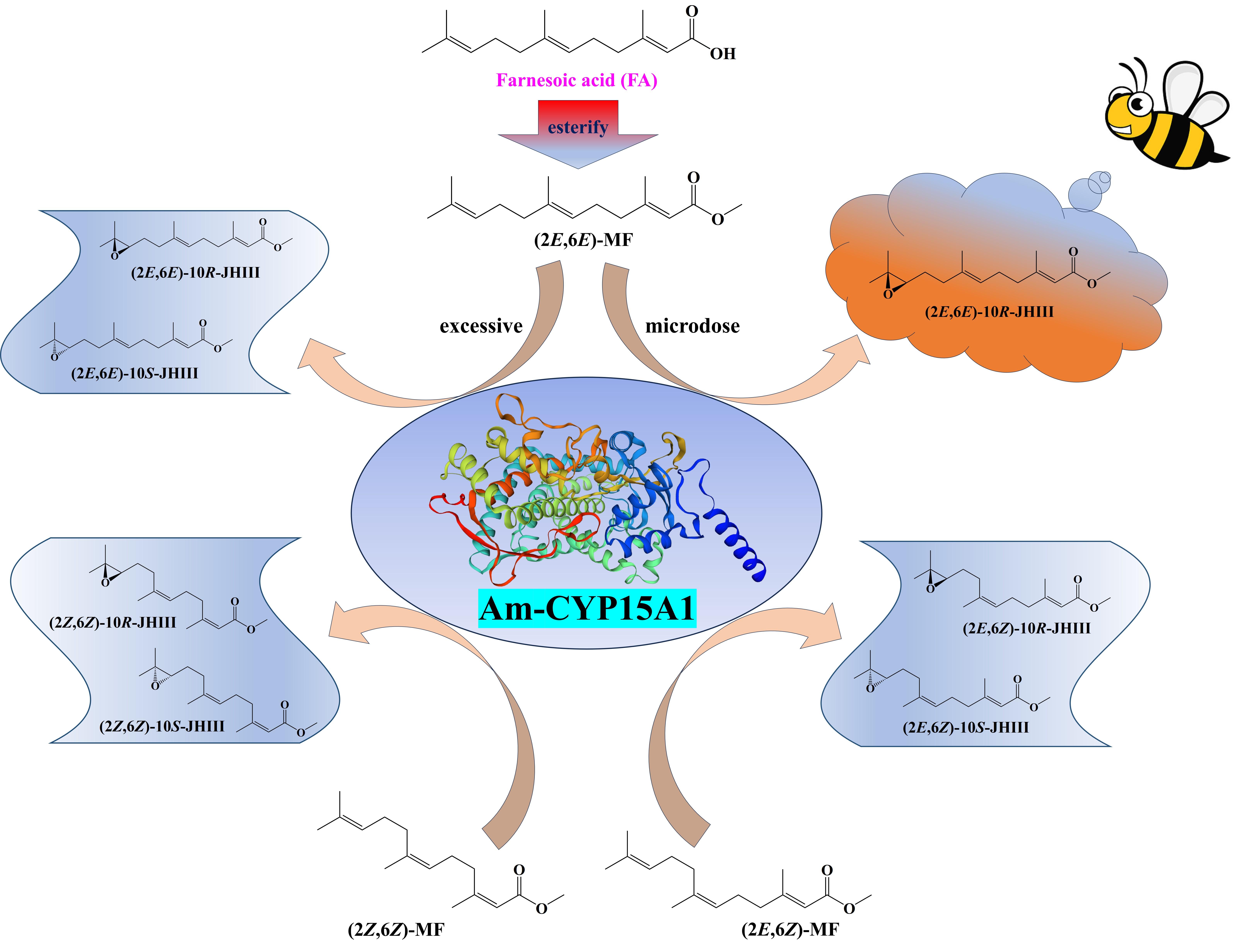 大部分昆虫体内均合成JH III用于调控其生理生物学功能,且均特异性合成R-JH III,但对于昆虫是如何精确调控并实现立体构型特异性合成,一直是生物学上未解之迷。团队为此进行了长达了4年的研究,首先原核表达获得蜜蜂JH III终端合成酶CYP15A1、JH结合蛋白JHBP和水解酶JHEH,通过色谱手性拆分并经圆二色色谱检测,获得独立的R和S-JH III,建立稳定的Tris-HCl培养体系,结合现代UPLC-MS/MS高精确分析方法,深入研究昆虫R-JH III的立体合成机制。结果表明,JHBP、JHEH对R或S-JH III并无特异性保护结合和水解,蜜蜂R-JH III终端合成途径遵循“先酯化后环氧化物”的顺序,CYP15A1偏好于催化底物甲基法尼酯MF进行环氧化,对前体底物保幼激素酸JHA催化效率低。对底物MF平面构型具有高度识别,蜜蜂通过调控前体MF几何构型(2E,6E)的精准合成,精确调控生成2E,6E,10R-JH III,改变MF几何构型(2E,6E;2E,6Z;2Z,6Z)将导致JH III在几何、立体结构和比例上的改变。同时,蜜蜂可精确控制体内前体MF滴度,从而调控R-JH III合成,改变MF滴度则同时合成S-JH III。我们的研究首次阐明了昆虫体内R-JH III的立体合成分子机制,为进一步揭示昆虫JH III在变态发育、繁殖调控功能中的立体差异性,以及为基于JH立体高效干扰的有害生物防治分子靶标的筛选提供一种崭新思维。suncitygroup太阳新城2019级博士生侯建敢为该论文的第一作者,李雪生副教授为论文的唯一通讯作者,本研究工作得到国家自然科学基金项目及广西农业环境与农产品安全重点实验室的支持。(J. Agric. Food Chem.2023.11,论文链接https://doi.org/10.1021/acs.jafc.3c05385)
