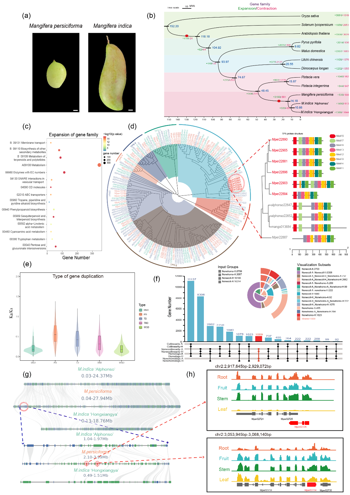 研究团队发现天桃木与芒果的分化发生在约 1400 万年前,且二者均经历了两次全基因组复制事件,表明二者亲缘关系密切。进一步研究发现,天桃木基因家族的扩张主要集中在环境适应性相关途径,如萜烯合成、苯丙烷生物合成和 ABC 转运蛋白等通路。此外,研究团队还鉴定出天桃木相对于芒果独有的 1,009 个基因,这些基因主要富集在植物—病原体相互作用等环境适应性通路中。该研究系统性揭示了杧果属中天桃木与芒果的亲缘关系,明确了二者在进化过程中形成的与环境适应性密切相关的特有基因,尤其在 TPS 和 NLR 基因家族中表现出独特特征。相关基因的近端重复与串联重复可能是导致其多样性的主要机制,并在天桃木性状多样性的进化过程中发挥了重要作用。