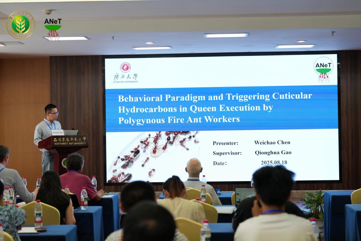 公司高琼华老师课题组积极参与了此次论坛,与国内外同行进行了广泛而深入的学术交流。2023级植物保护研究生叶咏昊和2023级资源利用与植物保护研究生陈伟朝分别汇报了蚂蚁性别决定基因演化和红火蚁工蚁杀后行为机制的研究进展。在“Session 3: Physiology”环节中,高琼华老师担任该环节主席并主持学术报告。