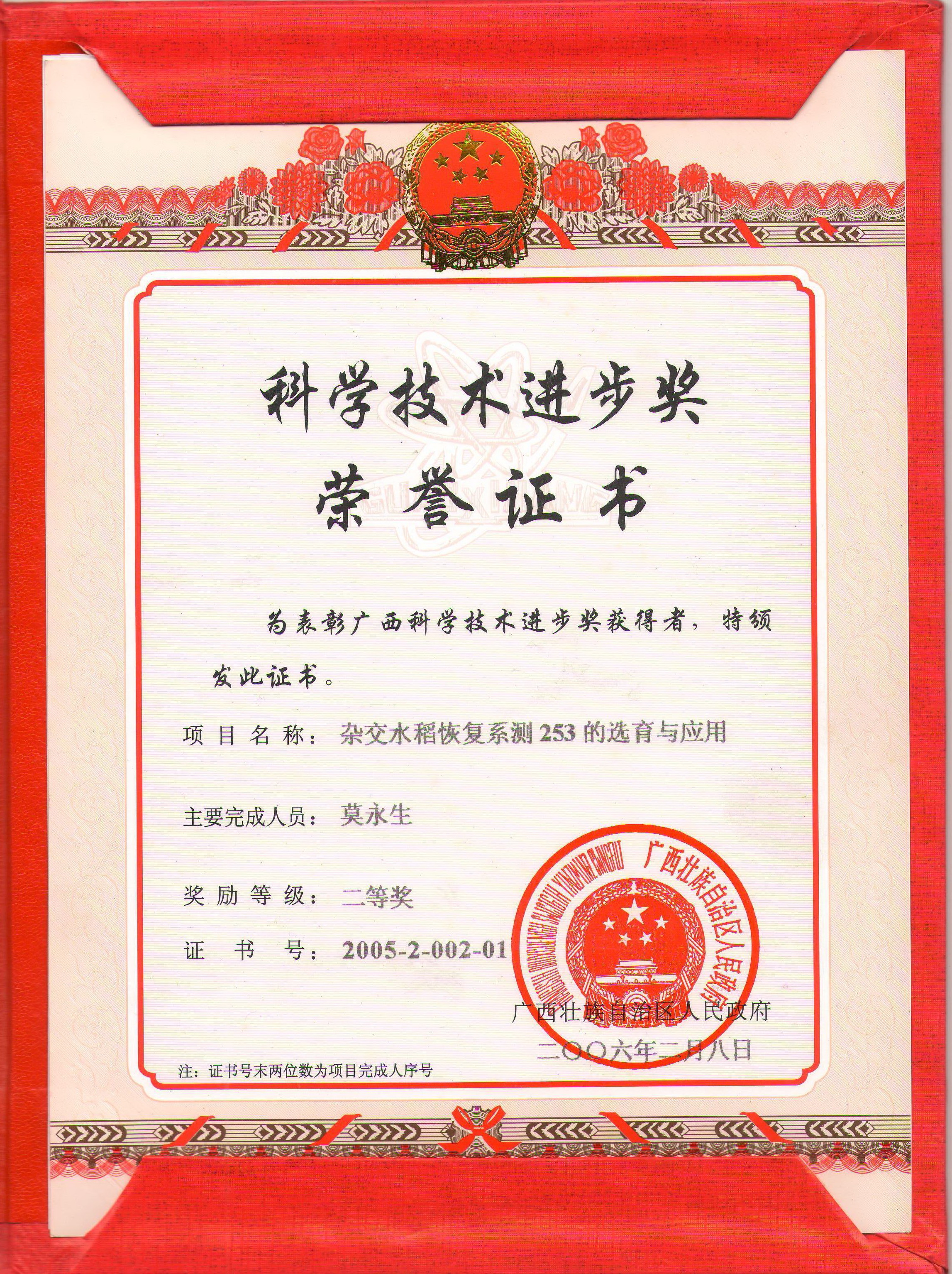 杂交水稻恢复系测253的选育与应用 二等奖-莫永生(2006.2.8)